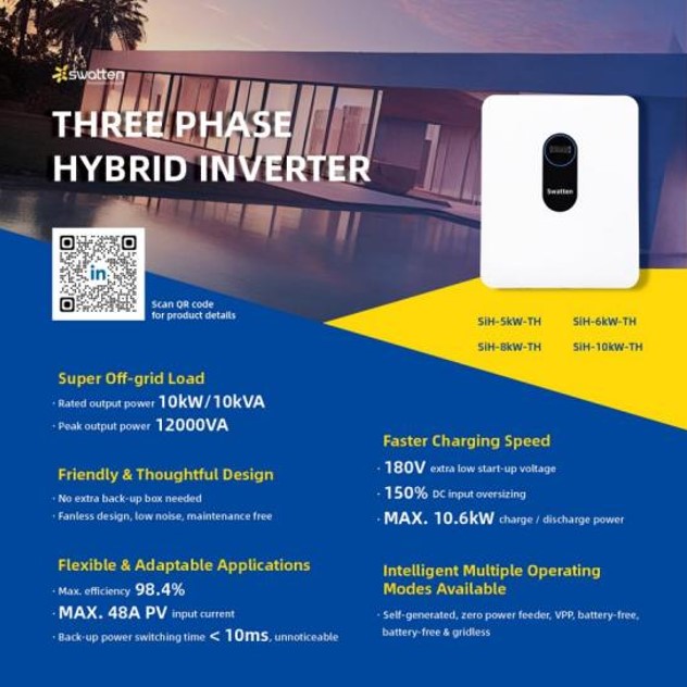 Nabídka společnosti Swatten zahrnuje jednofázové a třífázové hybridní střídače, modulární stojanové baterie a stohovatelné bateriové jednotky. Třífázový hybridní střídač Swatten je velmi vhodný pro rezidenční zákazníky. Jednou z význačných vlastností 3fázového hybridního střídače Swatten je, že má funkci nesymetrického výstupu zátěže, a to i nesymetrického až do 100 %. V určitých situacích může mít jedna nebo dvě fáze vyšší nároky na výkon než ostatní fáze. To může vést k napěťové nerovnováze, která způsobuje problémy citlivým elektronickým zařízením.