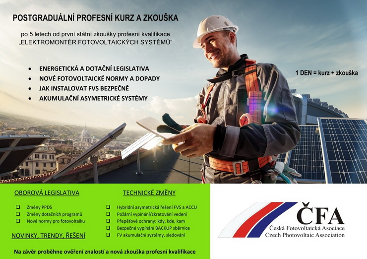 • Každý úspěšný absolvent po složení zkoušky bude zapsán do seznamu profesní kvalifikace na webu České fotovoltaické asociace, s uvedením kontaktních údajů pro ověření a vyhledání zájemci z programu Nová zelená úsporám