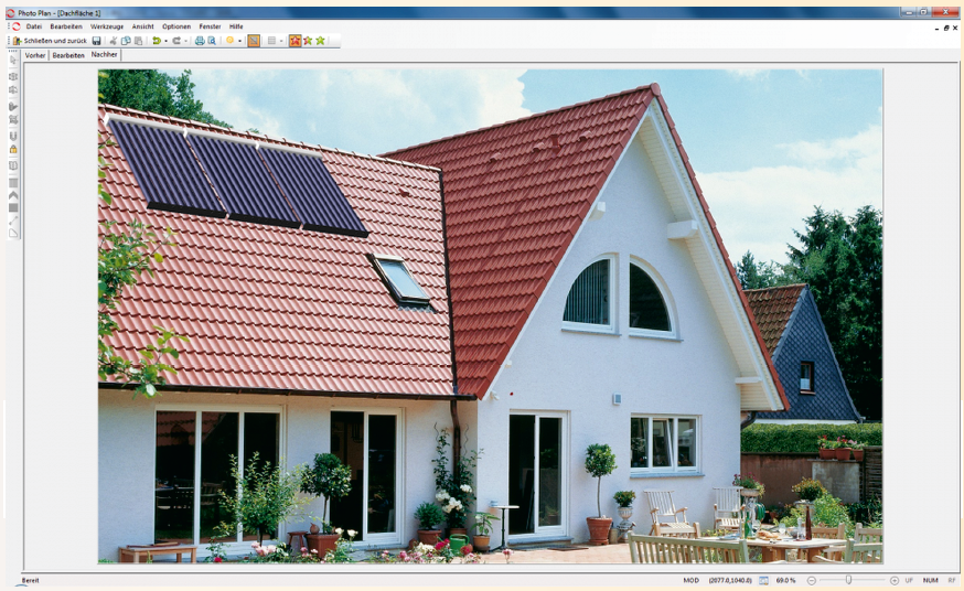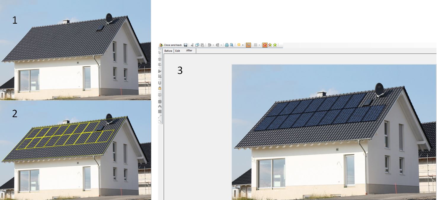 • Výběr zastínění a funkce objektů, jako jsou ploché nebo trubicové termální kolektory, komíny, ventilace, vikýře, fasádní a střešní okna nebo dveře.