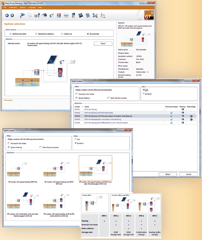 GeoT*SOL je profesionální a uživatelsky příjemný, specializovaný nástroj pro návrh a plánování systémů tepelného čerpadla. Můžete si vybrat mezi různými zdroji tepla a konfigurací systémů pro vaši lokalitu. Kličovým parametrem je integrace solárních tepelných systémů a dalších zdrojů tepla (bivalentní systém).