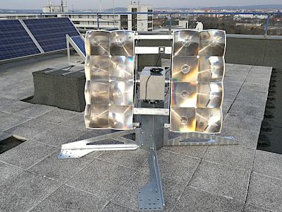 Díky sledovači slunečního záření se panel s koncentrovanou fotovoltaikou natáčí za sluncem, záření tak dopadá vždy na čočku.