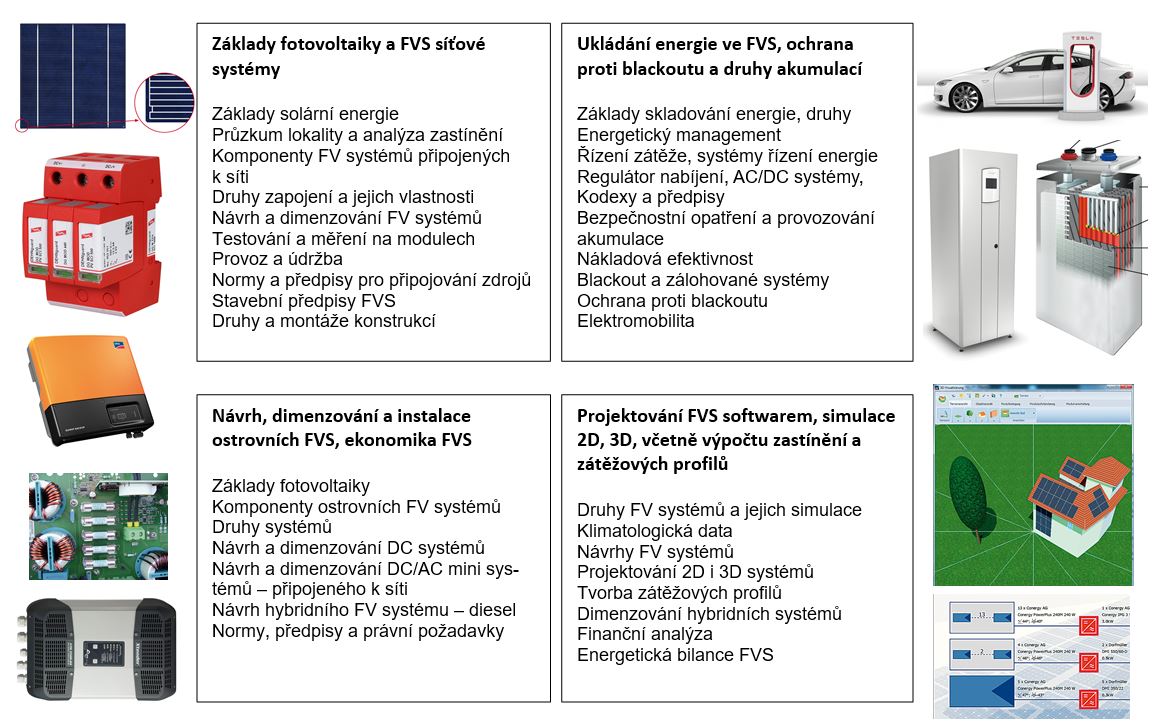 1.5. Vzdělávací modul „Fotovoltaický expert ČFA“ sestává ze 4 dvoudenních, na sebe navazujících vzdělávacích kurzů: Základy fotovoltaiky a FV síťové systémy, Návrh, dimenzování a instalace ostrovních FVS, ekonomika FVS, Ukládání energie ve FVS, ochrana proti blackoutu a druhy akumulací, Projektování FVS softwarem, simulace 2D, 3D, včetně výpočtu zastínění a zátěžových profilů.